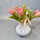 Trasforma il tuo spazio con questa elegante composizione di tulipani primaverili. Realizzata con fiori artificiali di alta qualità, mantiene la bellezza delicata dei tulipani senza richiedere manutenzione. Il vaso design moderno si adatta perfettamente a qualsiasi ambiente, dall'ingresso al salotto, aggiungendo un tocco di freschezza e colore tutto l'anno. Ideale per chi desidera il fascino della primavera senza preoccuparsi di innaffiature o appassimento. Un regalo sofisticato che dura nel tempo.